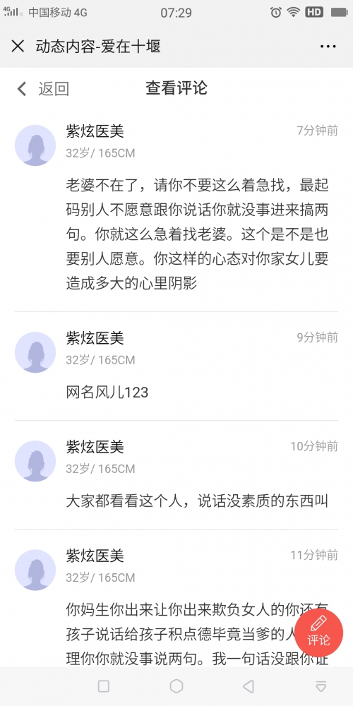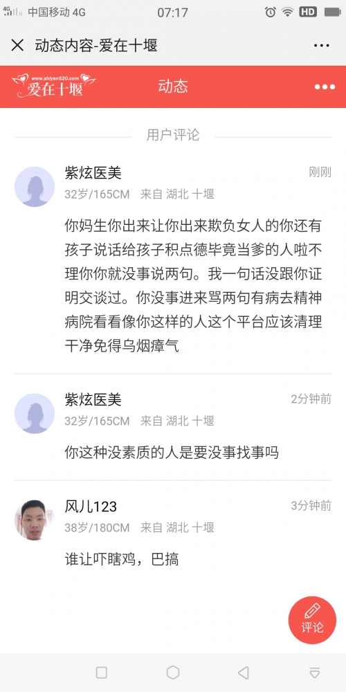 更新了一条心情: 这个风儿123的平台上如果有管理人员好好了解清楚上来干嘛的。是流氓还是三掉九流混混,每次我发个动态就进来侮辱人,最关键的是因为他跟我说话我一次没有理过他,因为不合适,所以没必要浪费时间但是这人只要我发了动态就进来说不要脸的话。难道我没有权利选择不理你吗?所有人跟我说话我都要一一回复吗?请大家看看这个人还有照片记住他的长相特别女同志千万别跟这个流氓有任何交朋友 全文
